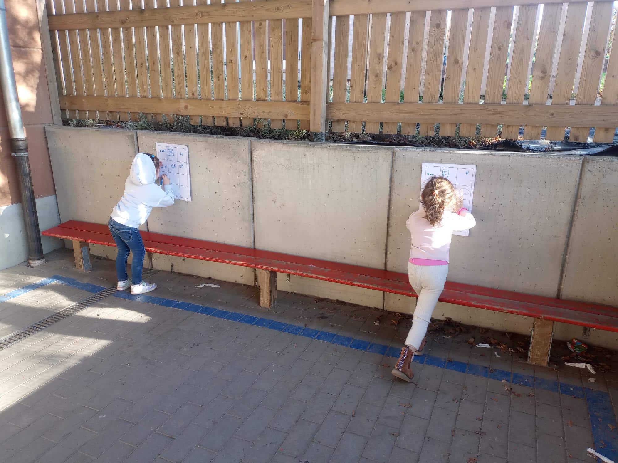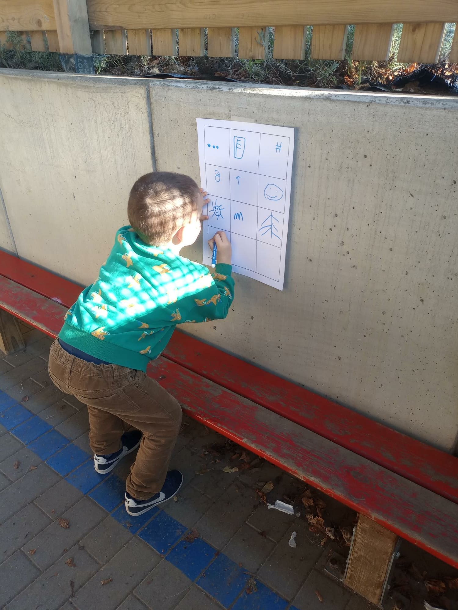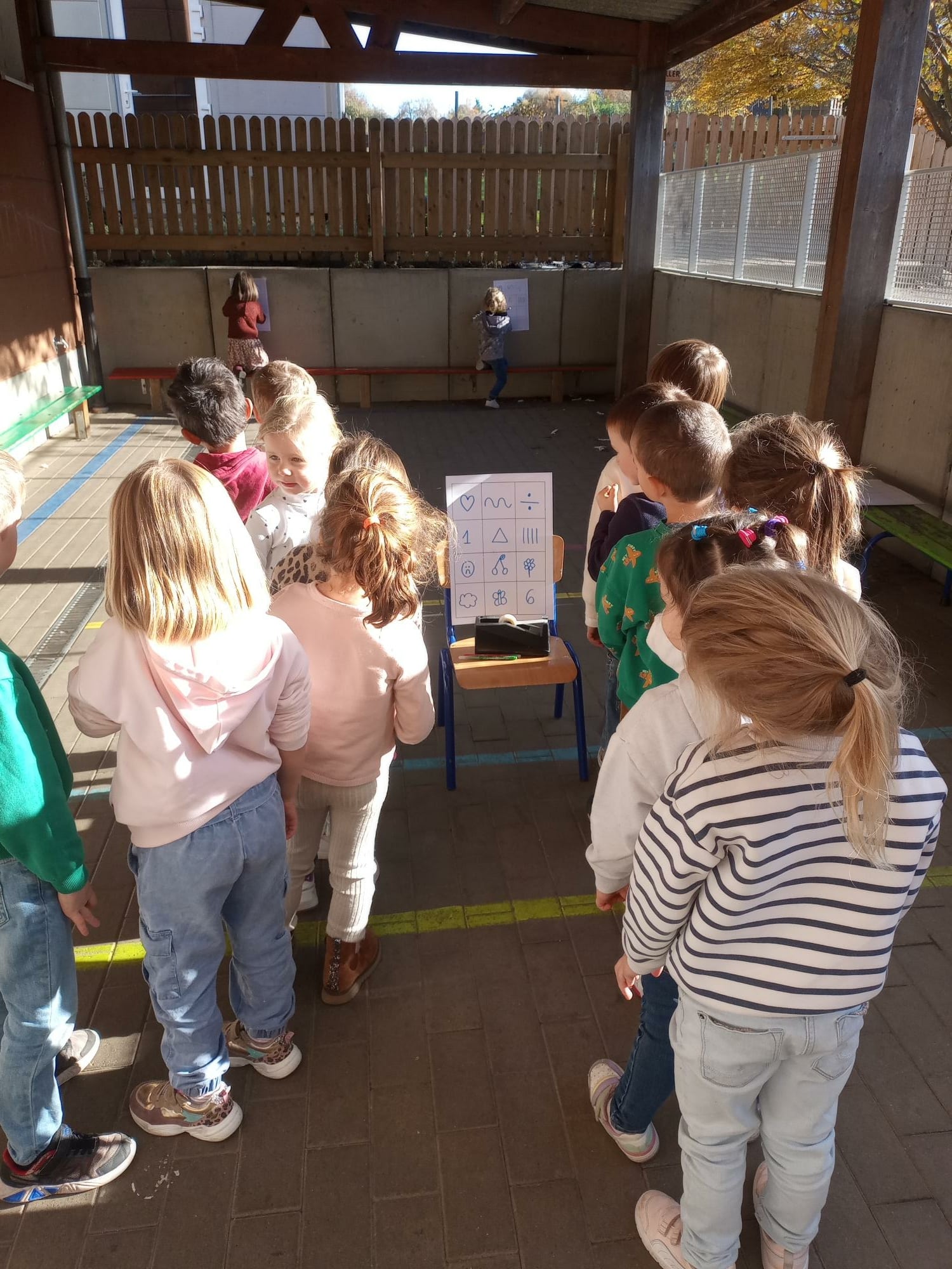 Une activité coopérative au grand air ! Sous le soleil, les enfants travaillent ensemble pour développer leur esprit d’équipe et leur structuration spatiale. Par petits groupes, ils observent un référentiel rempli de formes et de symboles. Après l’avoir mémorisé, ils courent jusqu’aux grandes feuilles accrochées au mur un peu plus loin pour y reproduire les dessins à la bonne place.