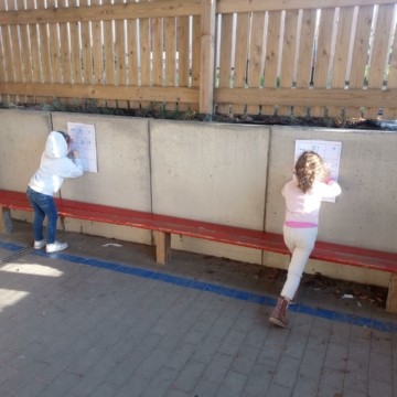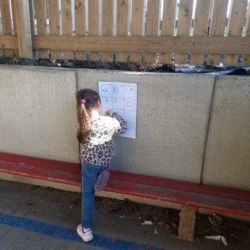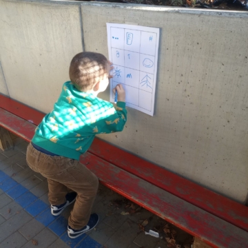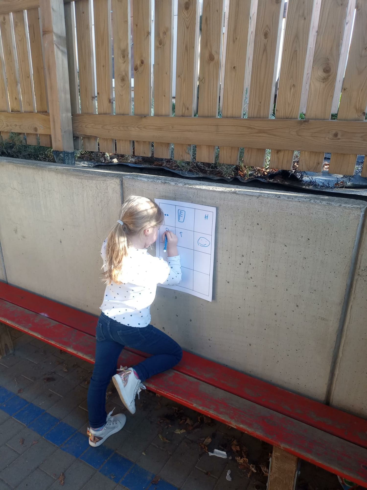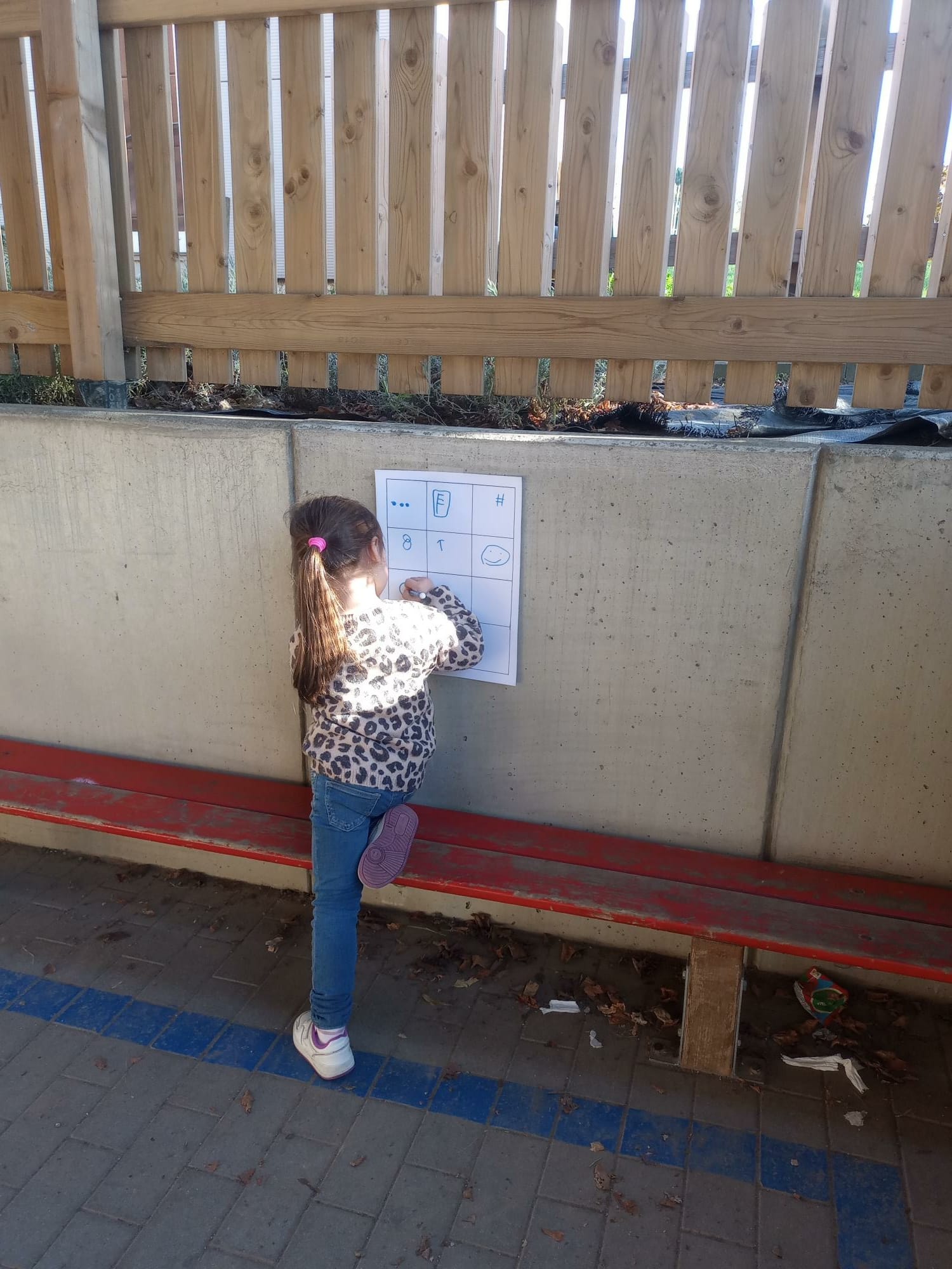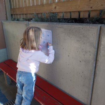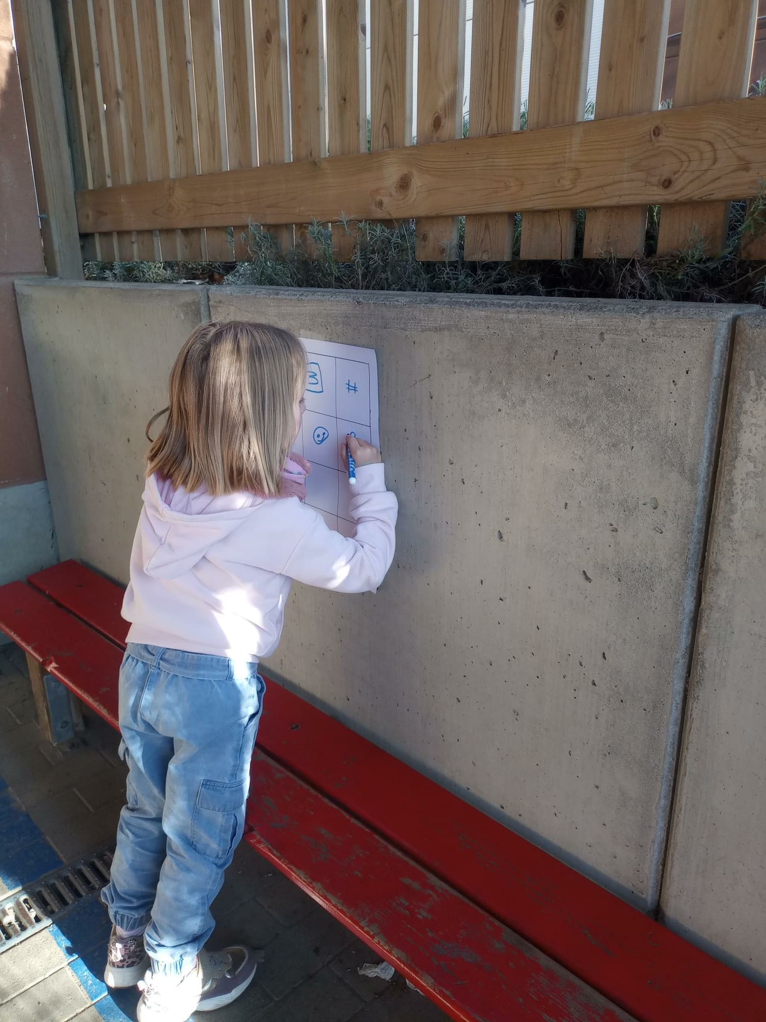 Une activité coopérative au grand air ! Sous le soleil, les enfants travaillent ensemble pour développer leur esprit d’équipe et leur structuration spatiale. Par petits groupes, ils observent un référentiel rempli de formes et de symboles. Après l’avoir mémorisé, ils courent jusqu’aux grandes feuilles accrochées au mur un peu plus loin pour y reproduire les dessins à la bonne place.